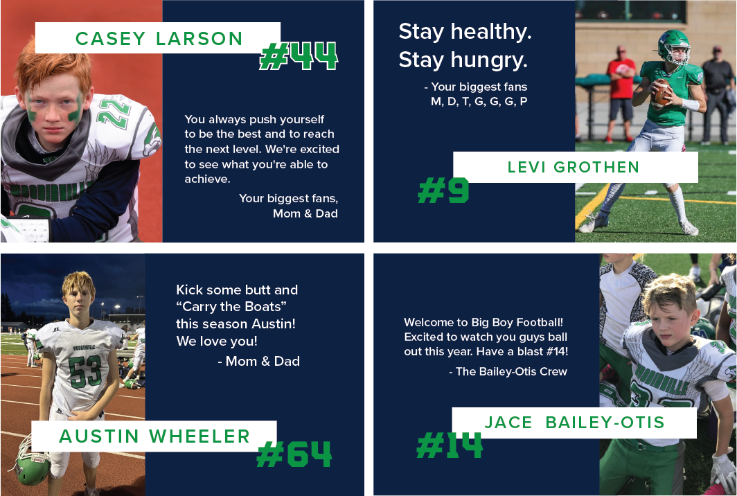 Player Ads are a great way to give your athlete a shoutout—you can cheer them on or celebrate their hard work with a message & favorite photo. These ads are included in the printed programs for purchase at each home game.